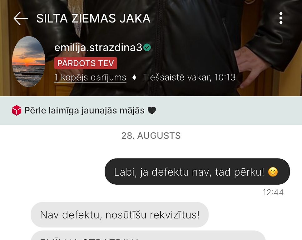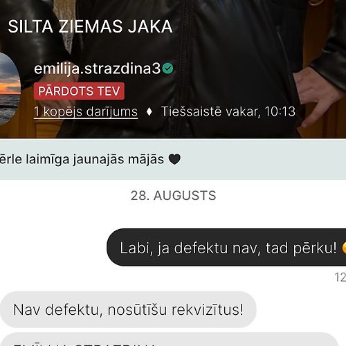 Iegādājos ādas ziemas jaku. Pirms pirkuma speciāli pārliecinājos pie pārdevējas, vai nav defektu, uz ko tika atbildēts, ka to nav. Diemžēl, saņemtajai jakai ir vairākas nepilnības – redzamas skrambas uz ādas, punktiņi, nenotīrāms pleķis uz kapuces un pat ieplīsis pie kabatiņas. Jaka bija arī nedaudz mitra iekšpusē, iespējams, transportēšanas dēļ , jo iepakojums bija bojāts vai arī nebija izžuvusi, taču tas nebūtu pats būtiskākais. Galvenais – neatgriezeniski defekti, par kuriem pārdevēja iepriekš nebrīdināja.