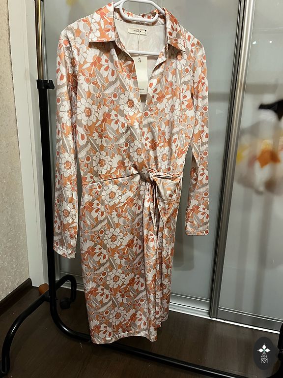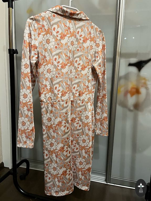 Ilus, värvikas kleit. Kogu pikkus 87 cm, rinnusümbermõõt ~48,5 cm, varrukaid saab lühendada. Palun pange tähele, et seljal on väike rebend, mille olen parima võimaliku viisiga kinni õmmelnud (vaata fotot).