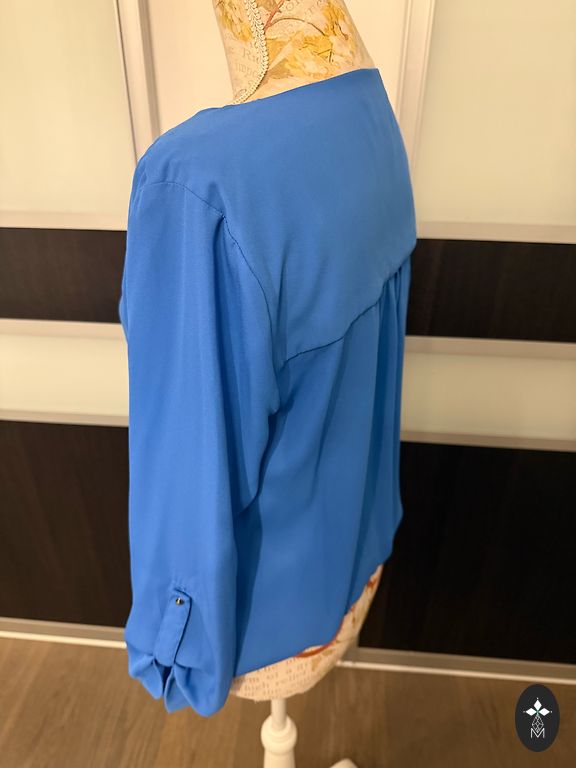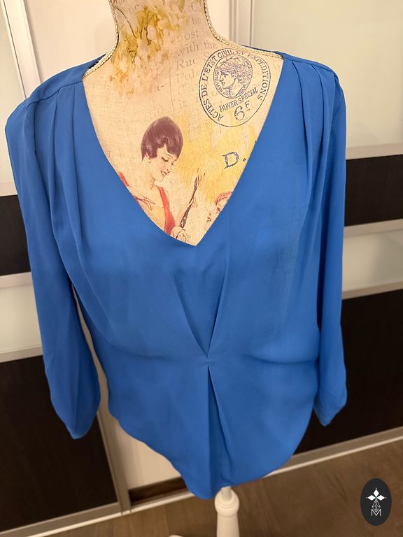 Beautiful and soft natural silk blouse in a smoky blue tone. Size 36, but fits perfectly from DE size 36 to 40. From armpit to armpit 52cm, front length 59cm, back length 70cm.