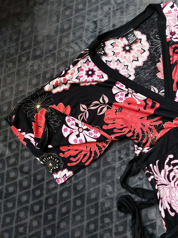 Liibuv kleit, millel on omamoodi ülekatte, mis kinnitatakse kuldse pandlaga. Kangas on elastne ja veidi raske, seetõttu langeb hästi. On olemas alusseelik. Käised on poolpikkad. Kleidi pikkus õlast mõõdetuna ~103 cm, rinnaümbermõõt ~42 cm. Suurus UK10.