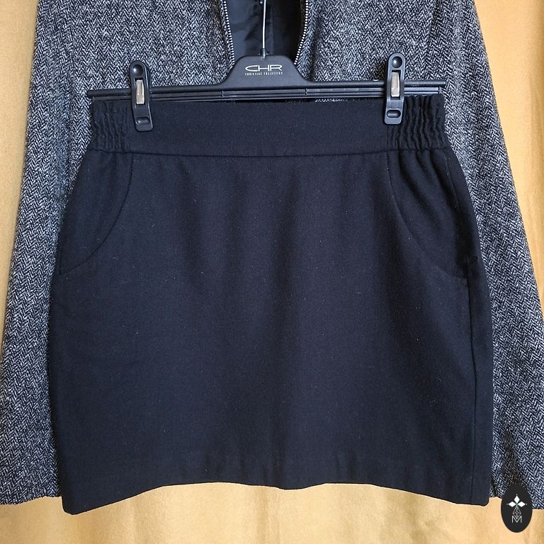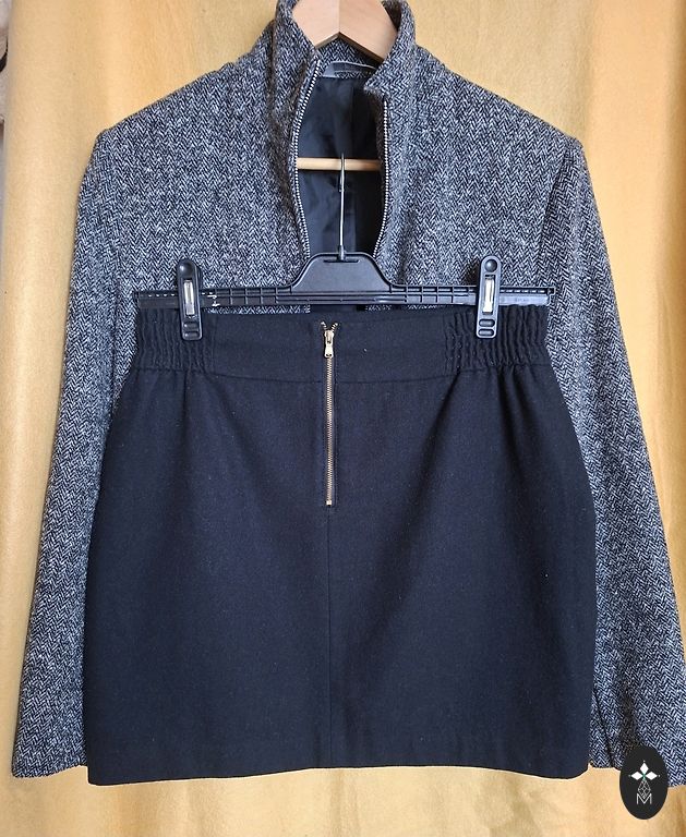 Trumpas tarpinio sezono švarkelis moderniu eglutės raštu. Yra dvi kišenės. Metalinis užtrauktukas. Juodas poliesterio pamušalas. Dydis UK14. Švarko ilgis ~54.