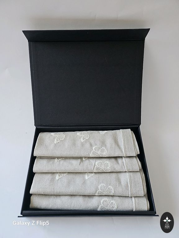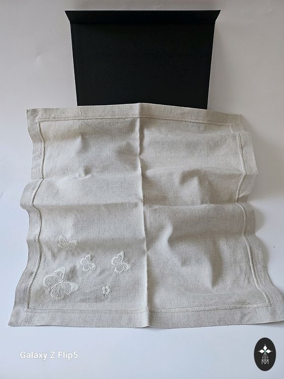 Tamborētas lina zalvetes. Jaunas. 39 x 76 cm. Katra 8 eur.