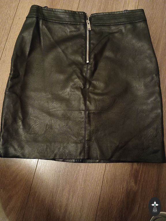 Melni ādas imitācijas svārki, praktiski jauni. Garums 46 cm, platums vidū 43 cm. Izmērs 38. Sūtīšana nav iekļauta.