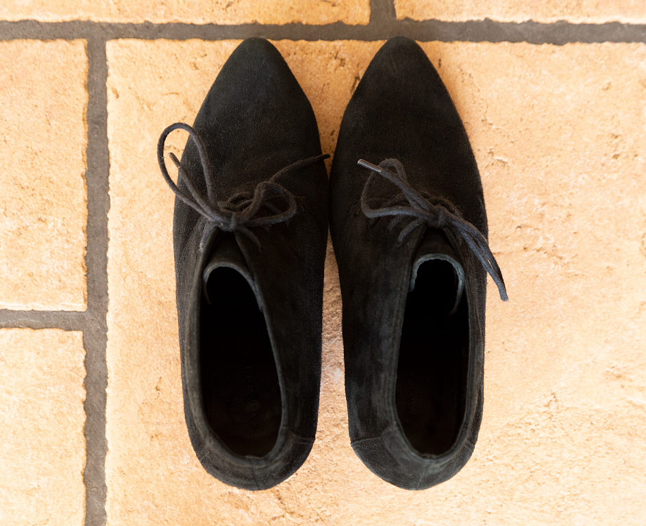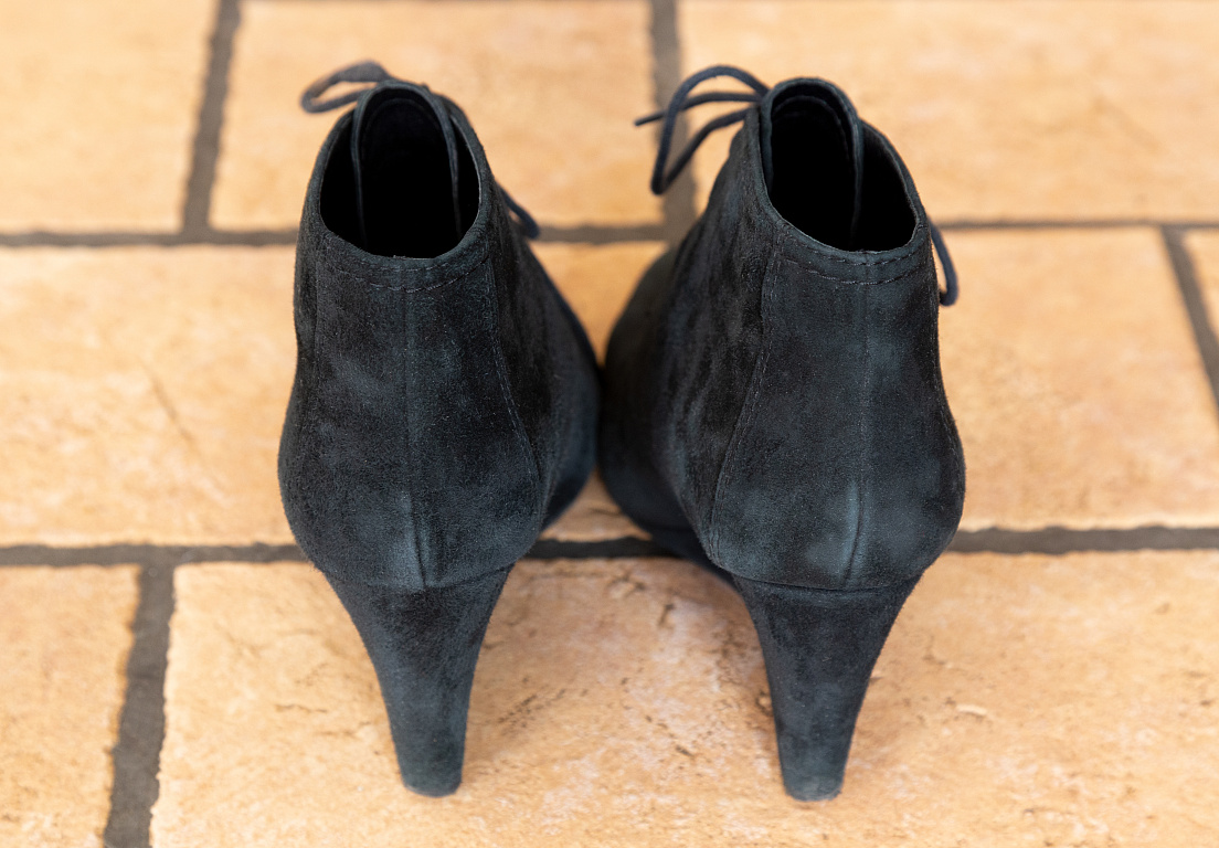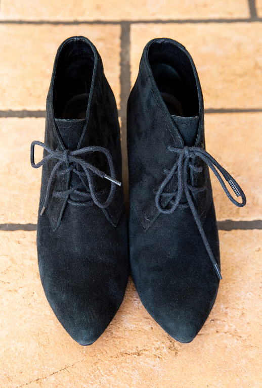 Fantastiski zamša botiljoni ar samta pušķi un spīdīgiem melniem papēžiem. Diemžēl meklē jaunas mājas, jo spiež. :( Virsū rakstīts 36 izmērs, bet ir lielāki. Meitenei bildē ir 38 (nedaudz spiež), tākā realitātē ir ~37 / 37.5. Vilkti pāris reizes, papēži un zoles nav nostaigātas. Droši jautā papildus bildes un izmērus :)
