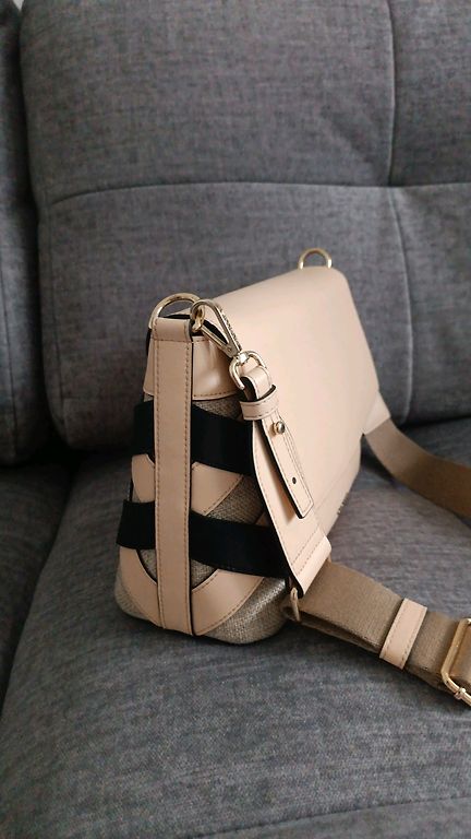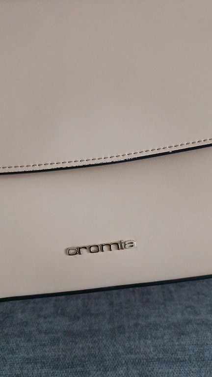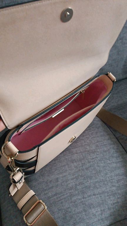 Small, with 2 short handles, beige with dark pink flowers, not bright. The inner lining is fabric in dark pink. In the middle, one layer with a coarse zipper, with additional pockets on both sides.