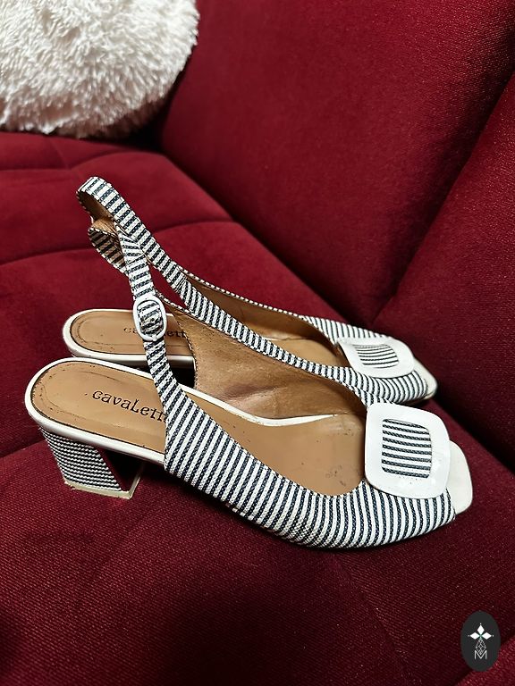 Selling elegant slip-ons with a gold buckle on the upper part of the shoe. Heel height is 3.5 cm, and the heel also has a gold trim. Foot length is 25.5 cm. Slightly used, in excellent condition.