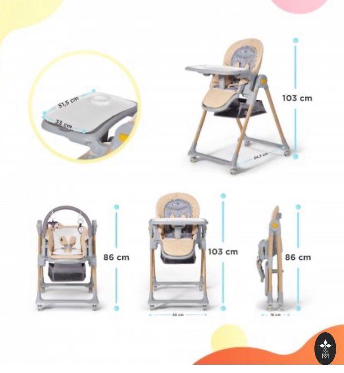 Ēdināšanas krēsls .Komplektā divas kreslas ,tāpēc var var mainīt. Multifunkcionāls krēsls, ,kas paredzēts bērniem no jaundzimuša vecuma līdz 3 gadiem. Polsterēts un komfortabls krēsls. Atzveltne atliecama trīs pozīcijās. Regulējamās muguras leņķa pozīcija .0-9 mēneši "atpūtas krēsliņa" pozīcijā.