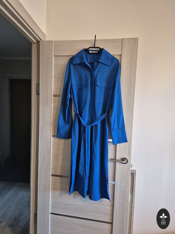 Beautiful midi-length dress with a tie bow. Pleasant soft, wrinkle-free fabric.