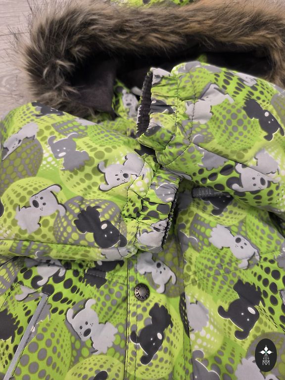 Nurodytas 92 dydis, tačiau man atrodo, kad 86 dydis labiau tiktų. Kombinezonas labai šiltas, galima nuimti kailį ir nešioti rudenį. Būklė puiki. Rankos užsisega, o ant kojų atskirai dėvėjome batukus (deja, batukų nuo kombinezono neliko).