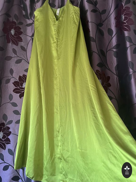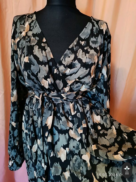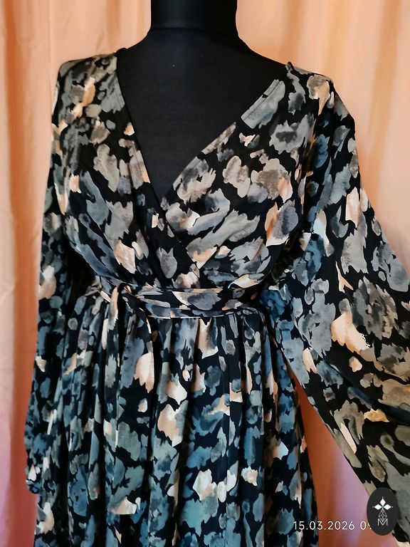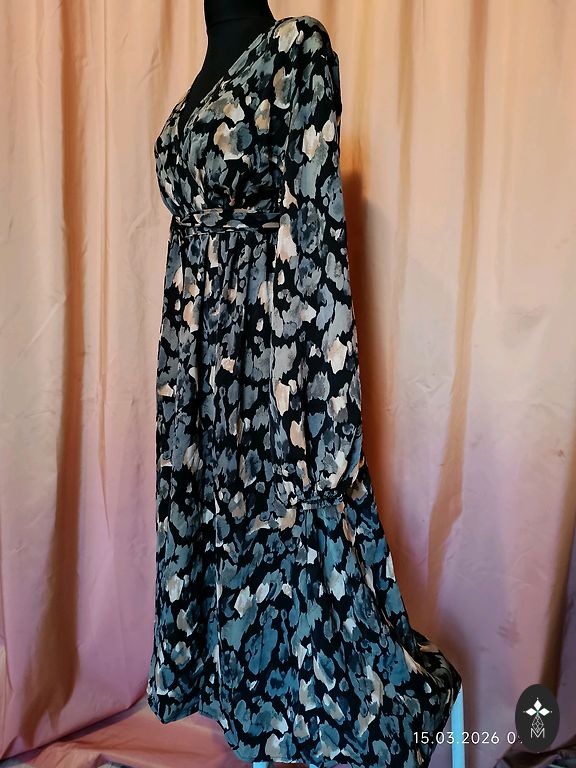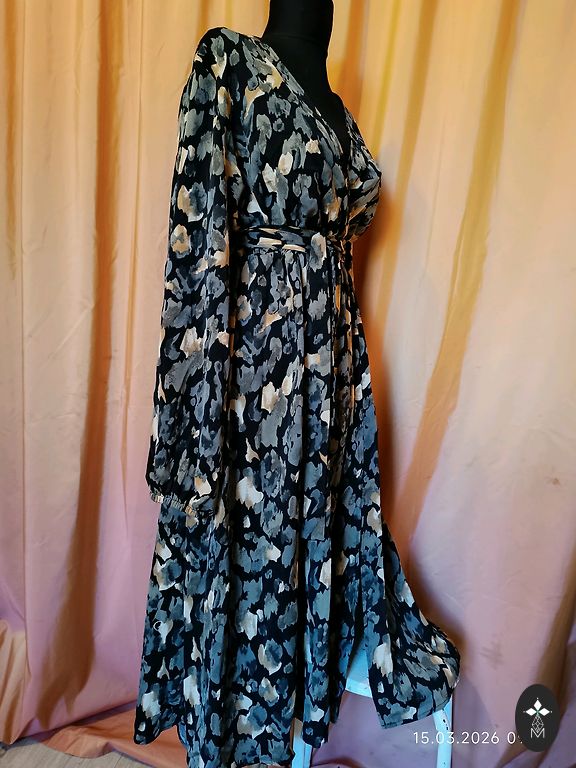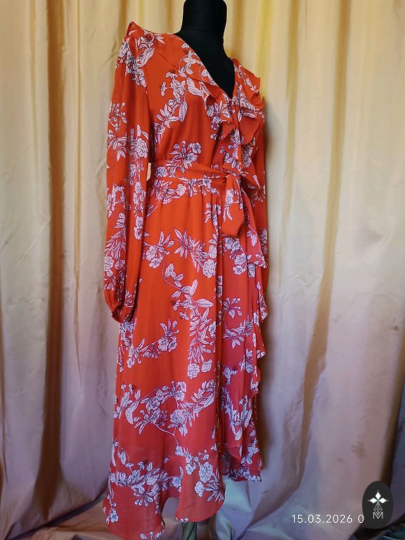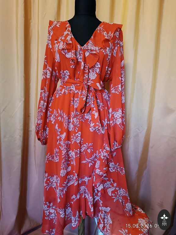 Uus, kandmata, puudusteta. Seelikul maitsekad volangid, rinnapartii all elastne. Elegantne värv ja lillemustriga. Sobib kõikideks aastaaegadeks. Valmistatud Itaalias. Rinnapartii 100 cm. Pikkus 145 cm. Varruka pikkus õlast 65 cm.