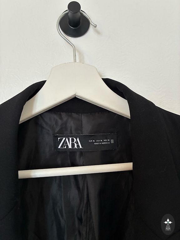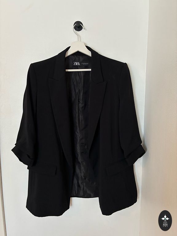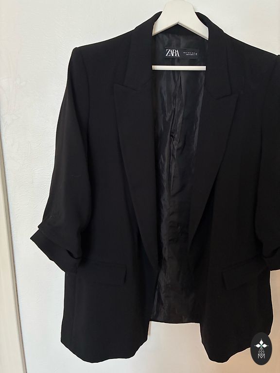 Žaketīte bez apkaklītes, 44 izm.,auduma sastāvā 43% vilniņa, elastāns, ērta. Audums nepievelk putekļus un nepūkojās, iekšpusē oderīte.Sānos ietilpīgas, slēptās kabatiņas, aizmugurē šķēlumiņš, piegriezums uz auguma, jostiņa. Garums 67 cm, piedurkņu garums 61 cm, krūtīs 106 cm. Bez defektiem, kvalitatīvs audums un šuvums.