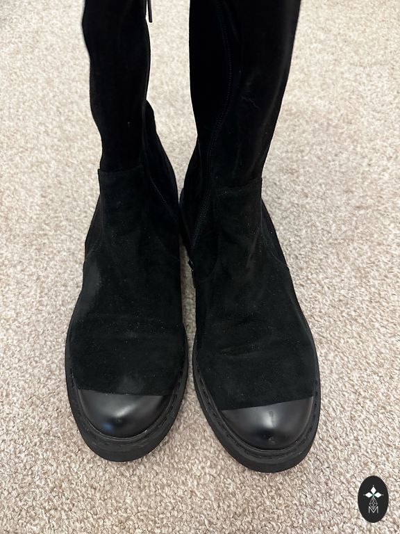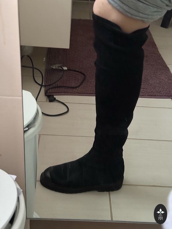 Ilgesni nei kelio, juodi dirbtinės odos batai, 38 dydžio, užsegami užtrauktuku šone.