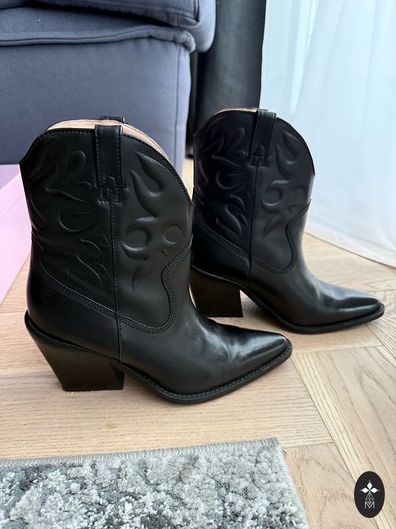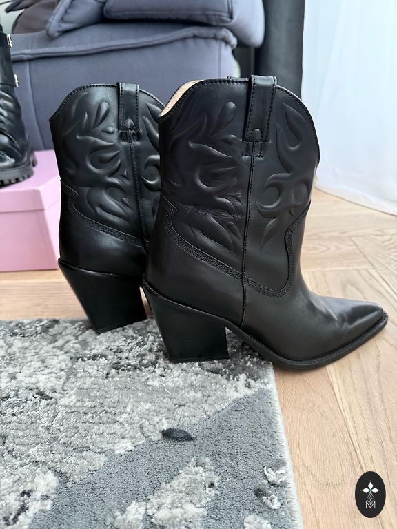 „Ash“ prekės ženklas. Stabilus 9,5 cm aukščio kulnas. Užsegamas priekyje – pagal pėdos plotį. Sagės vis dar priklijuotos, neatsipalaidavusios. Vidpadžiai 25,5 cm. Zomšinė oda su kniedėmis. Taikytas profilaktinis apdorojimas. Nešiotos tik vaikštant namuose prieš veidrodį. Stabilios, patogios. Aukštis nuo žemės 20 cm, dengia kulkšnį.