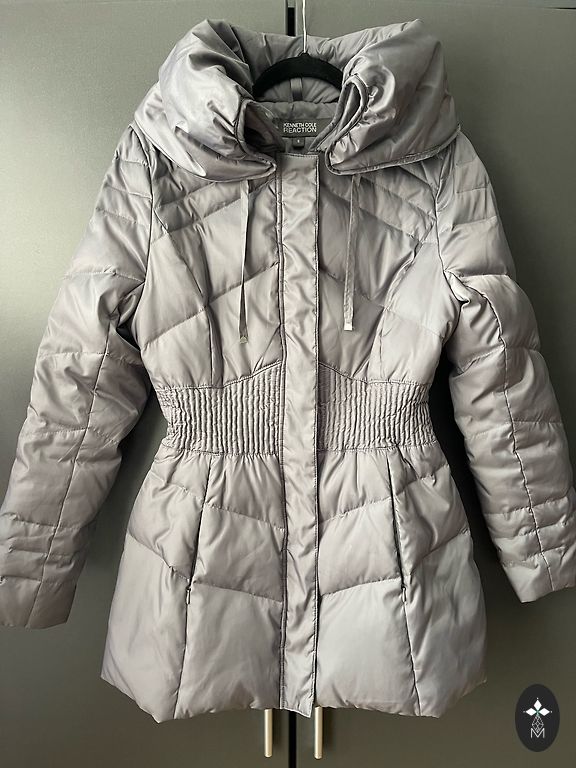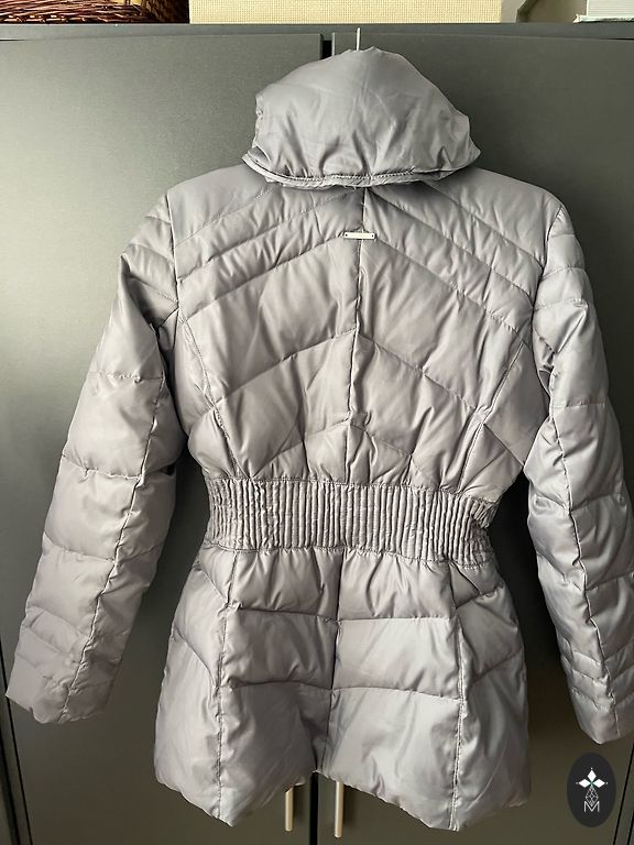 Mažai dėvėtas, prigludusios figūrai, su sagomis užsegamas apykaklės, galima skalbti skalbimo mašinoje, dydis tarp S ir M, pečių plotis 43 cm, ilgis 88 cm, pažastų apimtis 100 cm, liemens 92 cm, rankovių ilgis 63 cm.