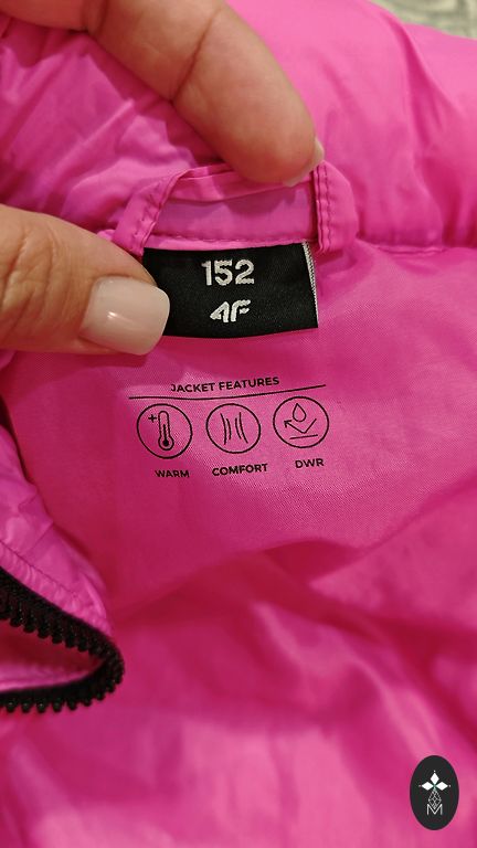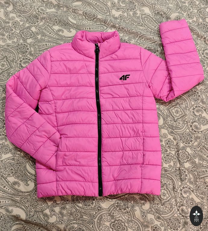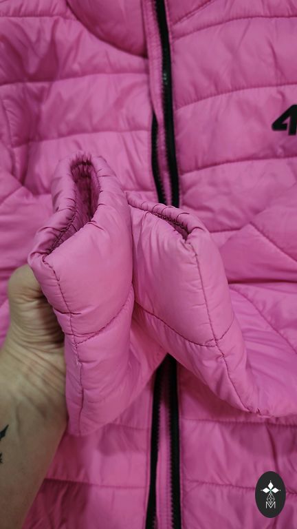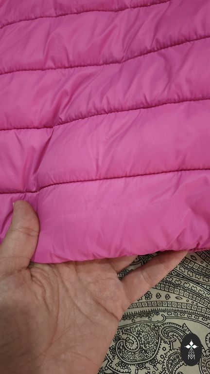 Kunstkarusnahast jope, mis muutub vestiks, varrukad on eemaldatavad. Defekt – puuduvad nööbid, mis kinnitavad varrukad lisaks tõmblukkudele, seega pole see suur probleem. Samuti puudub vöö, me ei kandnud seda jopega koos ja nüüd ei leia seda. Värv on kahvaturoosa, sõltuvalt valgustingimustest.