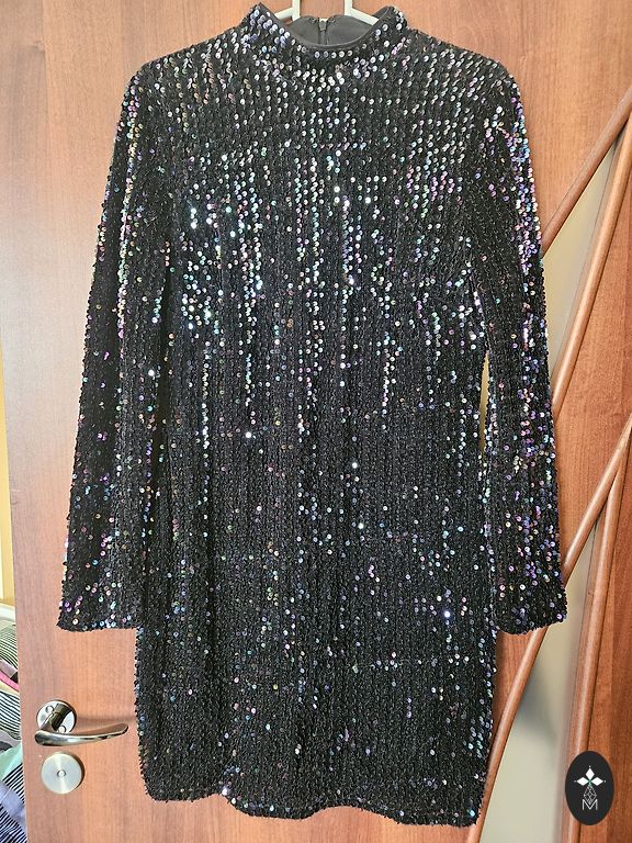Brīvi krītoša kleita ar kuplām piedurknēm. Garums virs ceļa. Derēs arī M izmēram