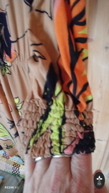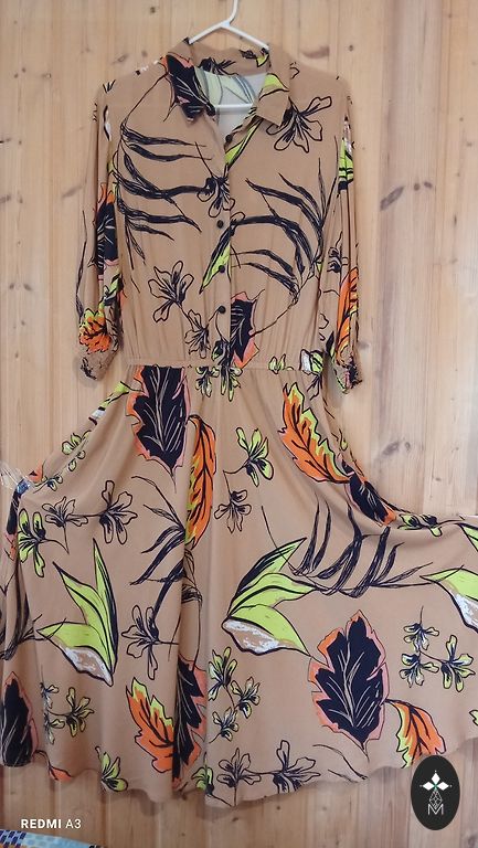 Medium-weight fabric, does not wrinkle easily. Dress without lining, zipper at the back center and 33 cm slit at the bottom. Dress length 128 cm. Bust 126 cm. Waist 128 cm. Hips 147 cm.