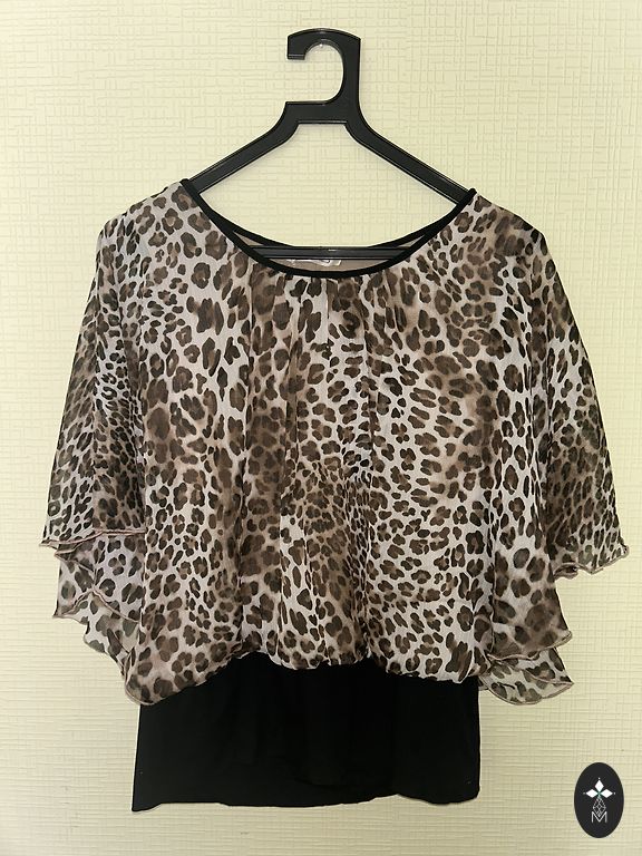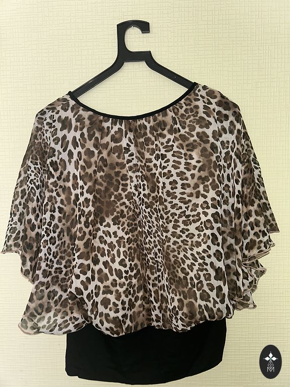 Grezna blūzīte ideālā stāvoklī, vienu reizi uz pasākumu uzvilkta. Lāsītes izgriezums aizdarē uz vienas podziņas. Derēs stabilam S un nelielam M izmēram. Krūtīs 106 cm, priekšas garums apmēram 60 cm, aizmugurē pagarinājums 68 cm. Piedurknes 3/4 daļas garas uz gumijas.