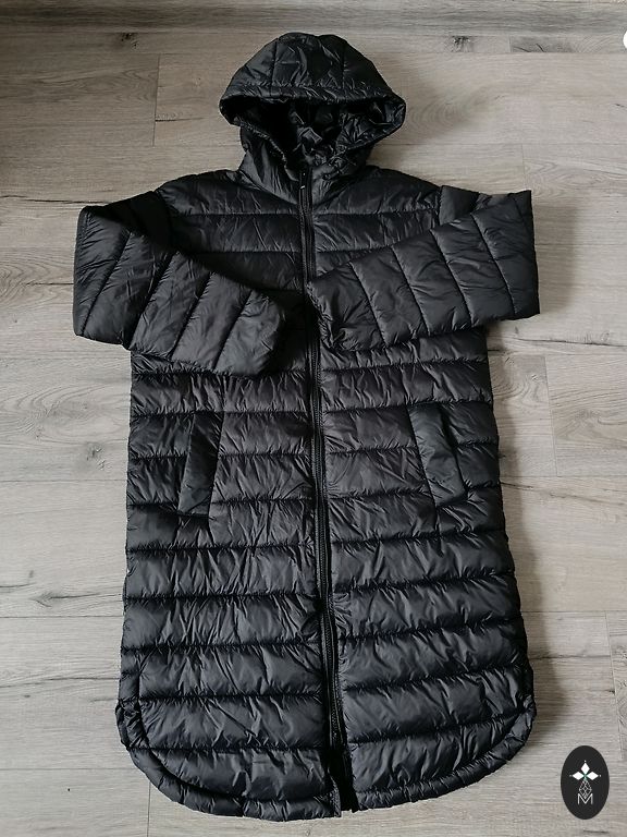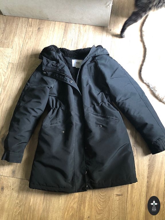 Kapuutšiga jope kantud üks hooaeg, täiesti nagu uus, pikkus 64 cm, varruka pikkus 66 cm, laius 48 cm.