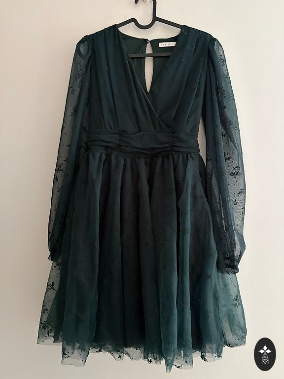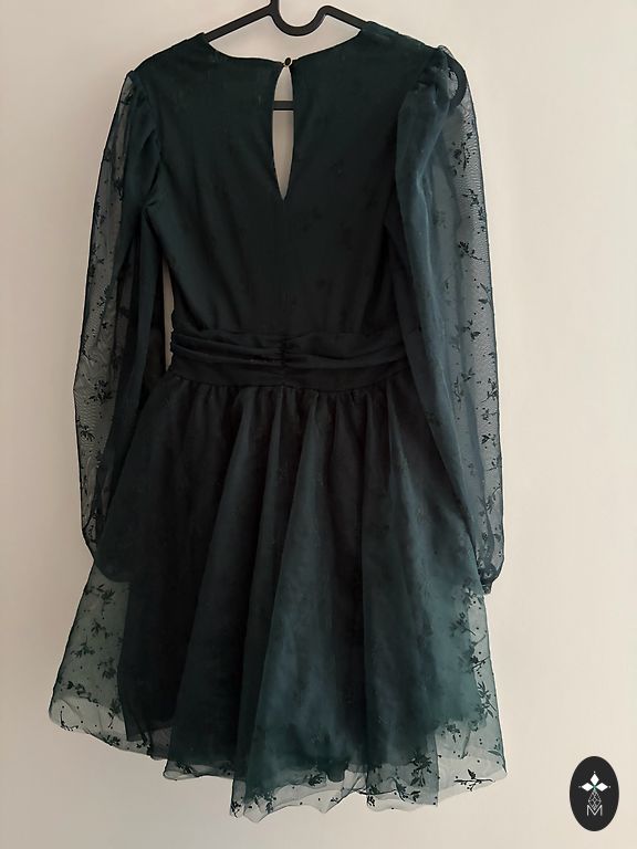 Massimo Dutti midi garumā kleita ar V veida izgriezumu, abās pusēs šķēlumi, kreisajā pusē rāvējslēdzējs.