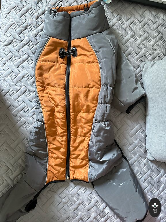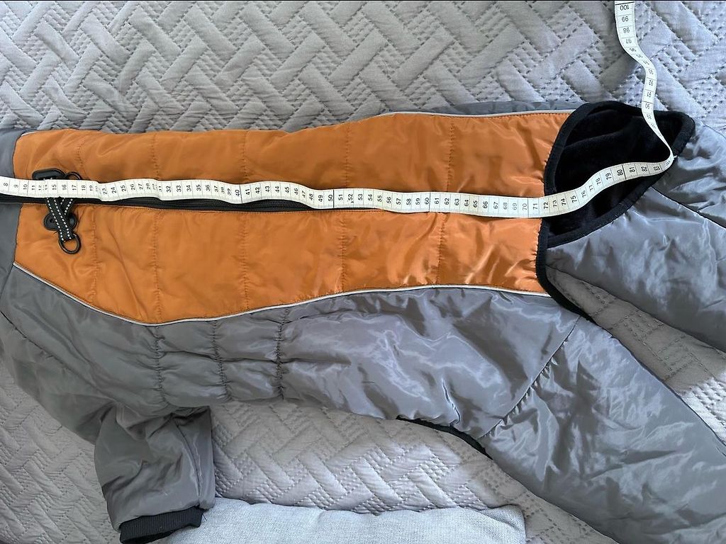 Uus, meile ei sobinud suurus. Kirjutatud 50. Lihtne selga panna ja pimedas helendab, kuna on sisse töötatud helkivad niidid. Pikkus venitamata 54 cm. Käppadele kauss on kõige suurem, sobib keskmisele ja suuremale koerale. Mõlemad kokku 8 eurot. Kingituseks uus pall.