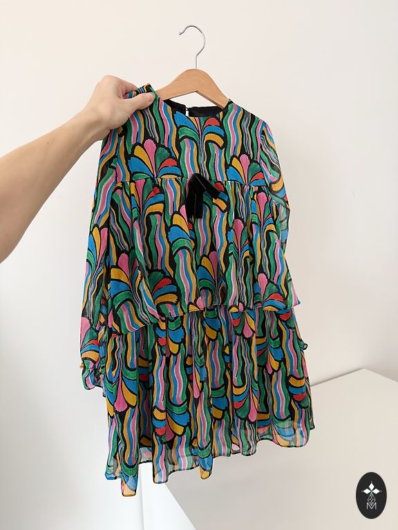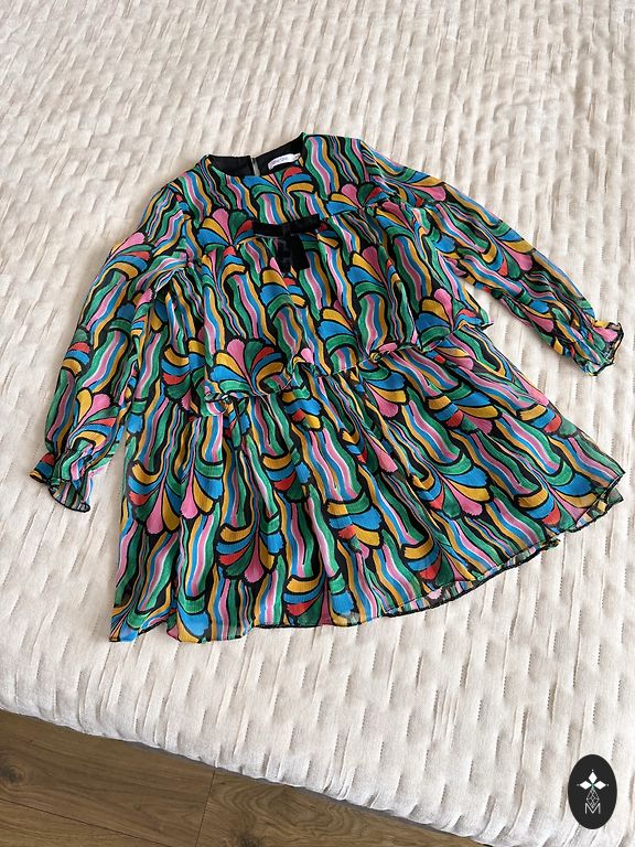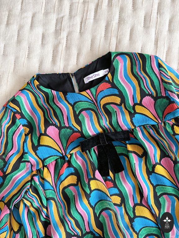100% polüester. Kootud ülaosa. Seelik koosneb kolmest kihist (vooder + 2 kihti läbipaistvat kangast). Vöökoht on elastne. Värv on lõhe (minu arvates). Ülemisel kihil on mõned tõmbed.