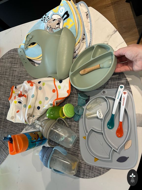 7.) Minikoioi-тарелка очень хорошая, потому что не скользит, ложка и фартук (дефект на 4-й картинке) - 13€