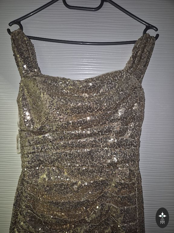 Disco dress in rose/gold color. Not worn because the party didn't happen. Size marked as M, but the style will surely fit L size as well. Bust 120 cm, length 97 cm, hips 110 cm.