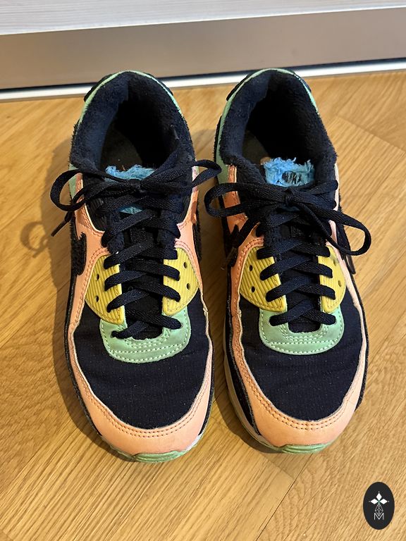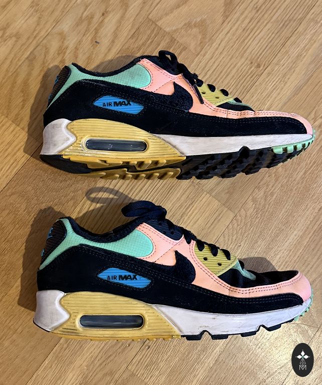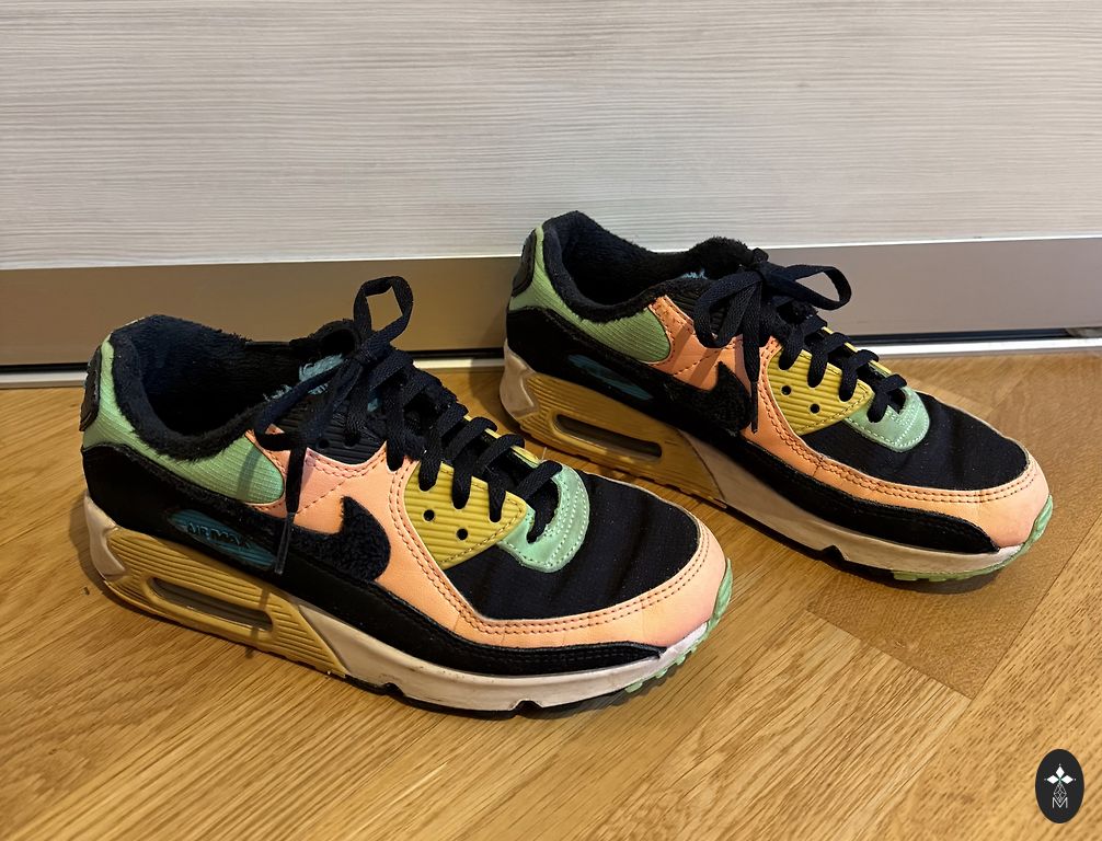 Light Nike sneakers size 35.5. Used but still in good condition. One sneaker has a worn fabric by the lace, visible in the photo.