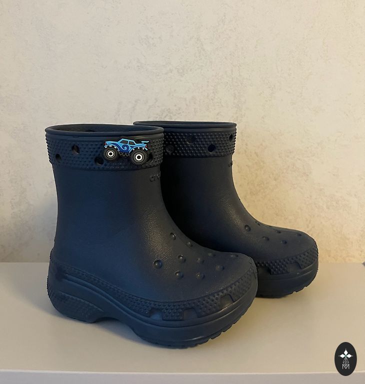 Nauji guminiai batai. Nupirkome, bet vis tiek netinka, rašoma 30 dydis, tačiau sakyčiau, kad yra mažesnei kojai. Vidpadis 16.5/17 cm, viduje šiltas padelis. Patys batai neturi šiltinimo.