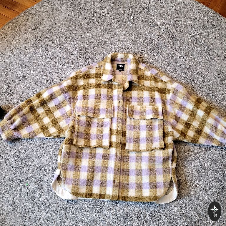 Must musta Zara jakk, mida saab kanda mõlemalt poolt. Üks pool on kangast, teine pool on karvane. Ühel tõmblukust puudub lukk, kuid jakk on siiski võimalik kinni panna.