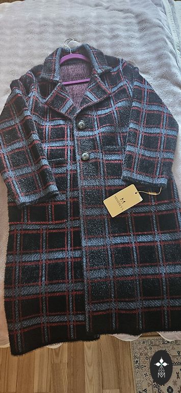 Jauns garš vilnas mētelis ar lielu apkakli, labas kvalitātes audums, vācu ražojums. Mēteļa garums 115 cm, platums no paduses līdz padusei 63 cm, platums vidusdaļā 65 cm, piedurkne 60-62 cm. Spontāns pirkums.