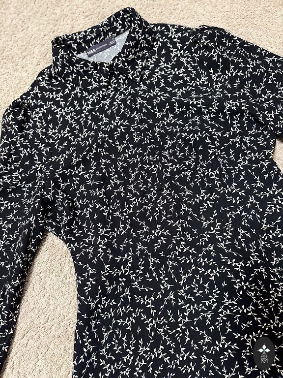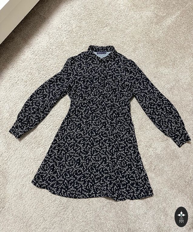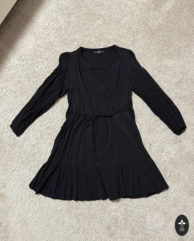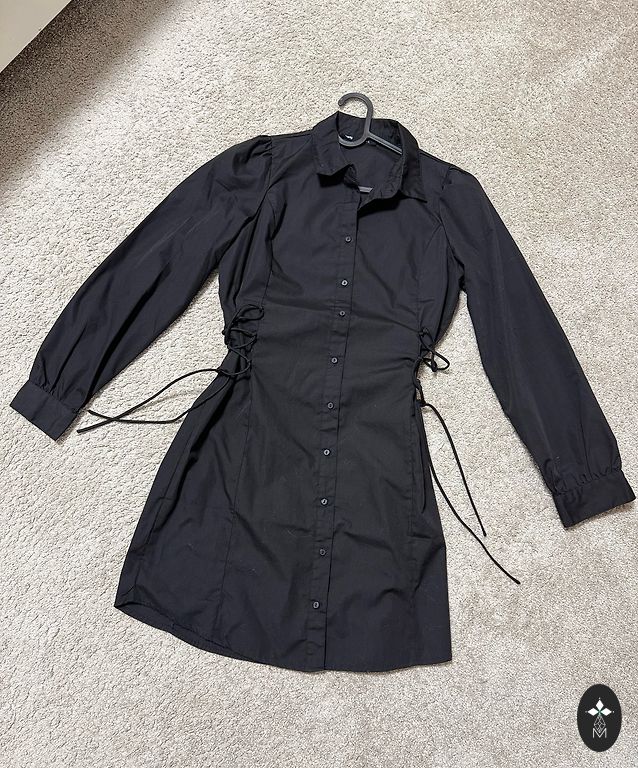 Pogājama, garā kleita ar zelta krāsas pogām - melna. Kleitai viduklī ir sasienama, auduma josta. Sastāvs: 65% viskoze, 30% poliesters, 5% elastāns. Garums: 129 cm . Vilkta vienu reizi.