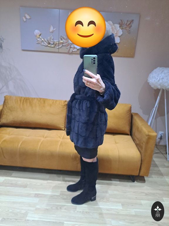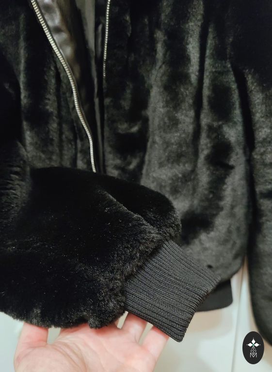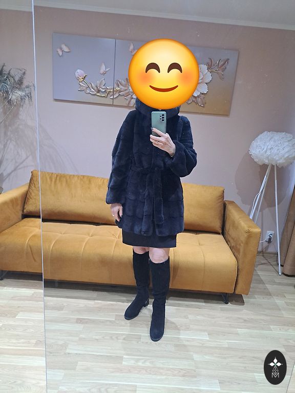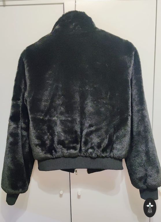 Melns, mākslīgās kažokādas kažociņš dekoratīvos slāņos.