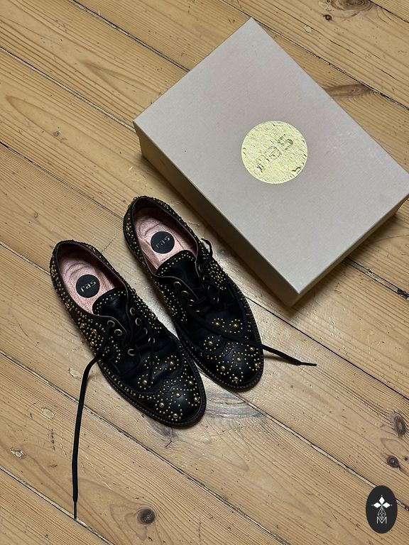 Black loafers. Spain. Upper material is leather, smooth pony fur lining with pattern. Inside is leather. Item is in good condition, size is small -35.
