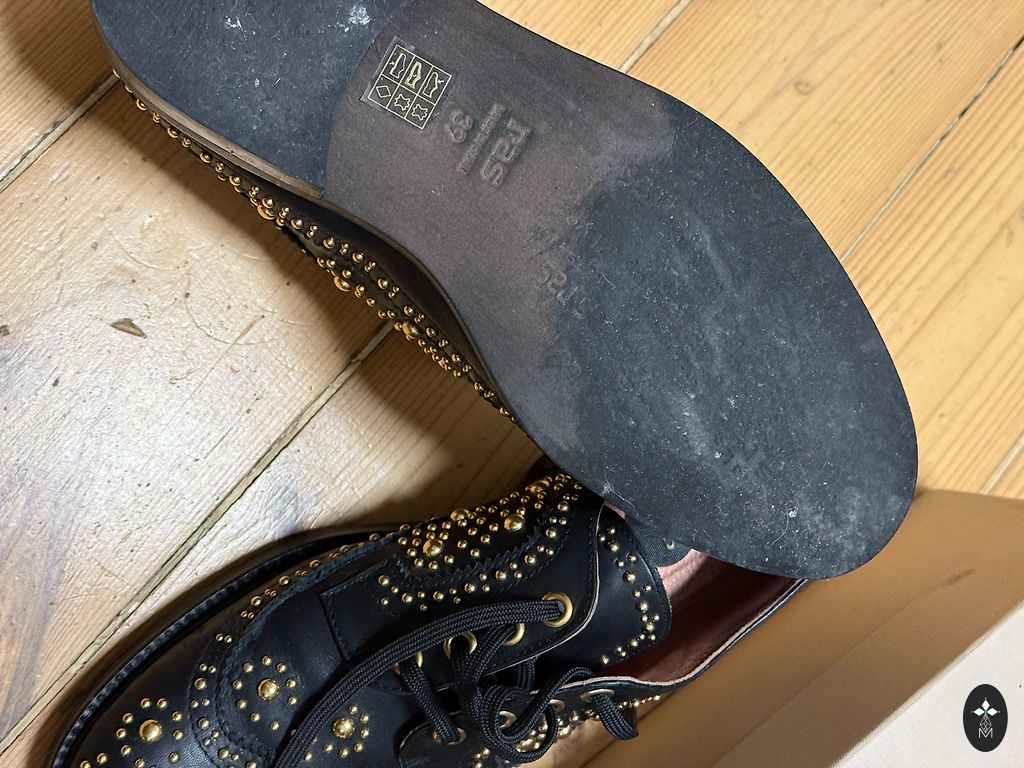 Upper material is leather, smooth pony fur lining with pattern. Inside is leather. Item in good condition, size small -35.