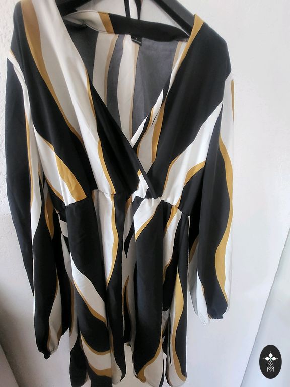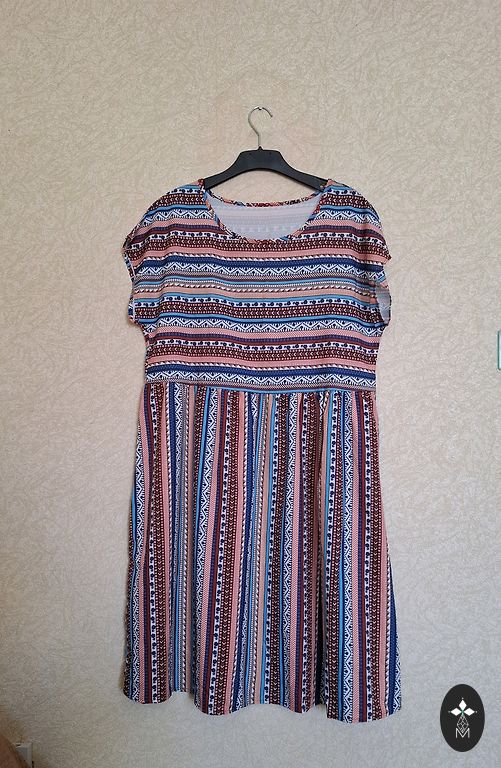 Kleita ar margrietiņām, kleitas apakšmalā volāns, pusgarās rociņas no pleca 55 cm, krūtis 120 cm. kleitas garums 100 cm, gurni 120 cm, auduma sastāvā 3% elastāns