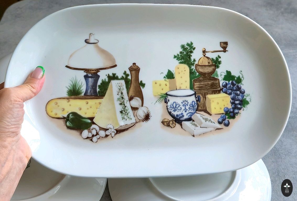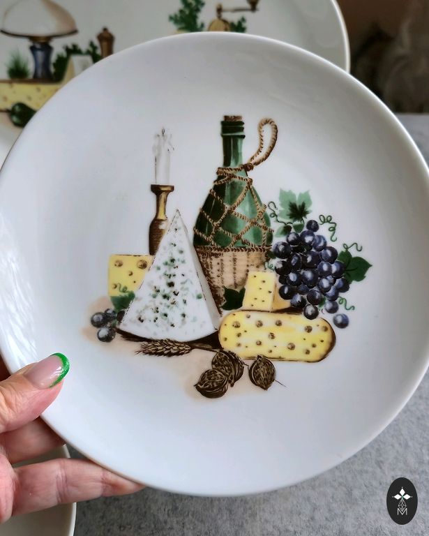 There are signs of use (wear on the gold plating, veining on one plate, glaze abrasion, and small defects from the manufacturing process (black dots)).