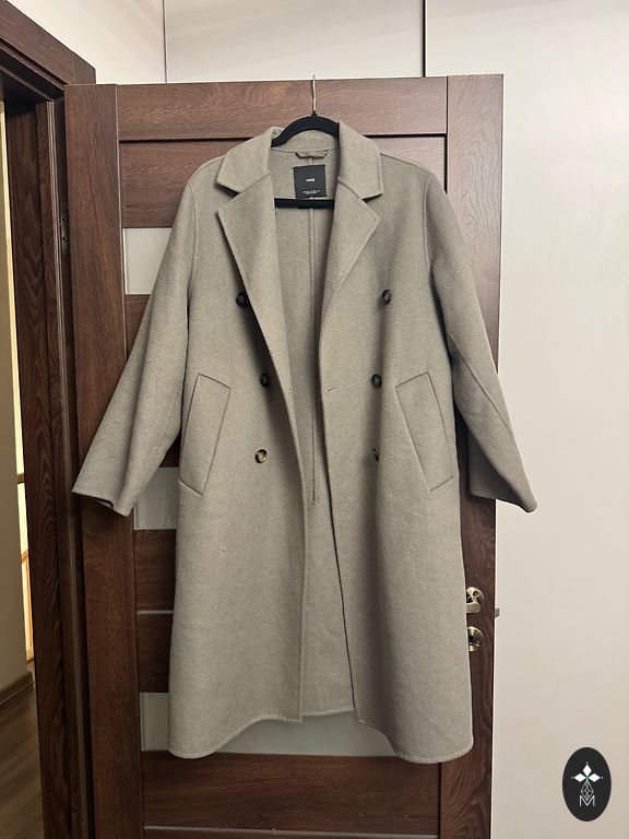 Ilus tumeroheline värv, buklee kangas. Koostises 51% villast, seetõttu soojendab hästi nii talvel kui ka ei ole liiga kuum kevadel. Vöökohal seotav vööga.