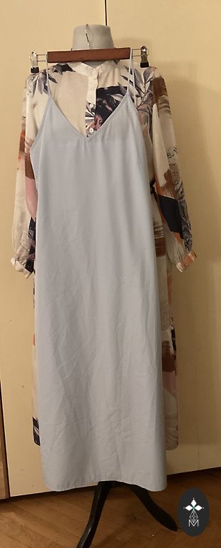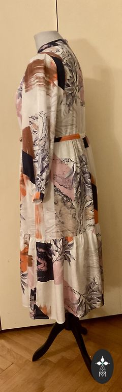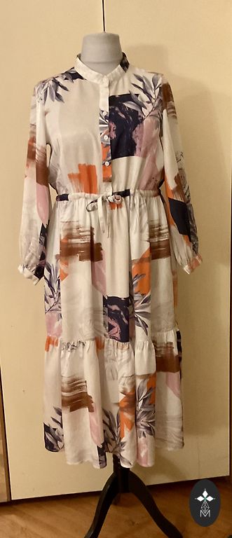 Izmērs M, bet reāli XXL, ļoti labs audums, kleita ir plandoša, ar jostiņu Garums 130, starp padusēm 78, reglana piedurkne no apkakles 62, platākajā bicepsa vietā apkārtmērs 48 cm