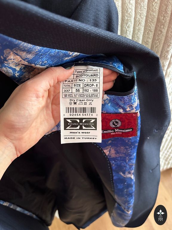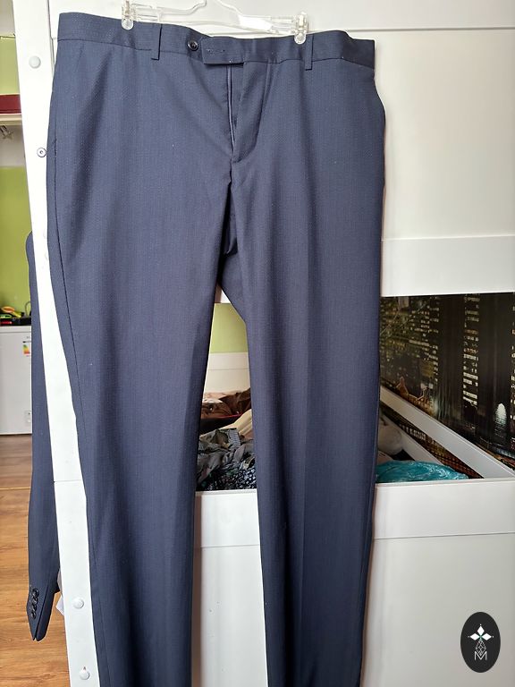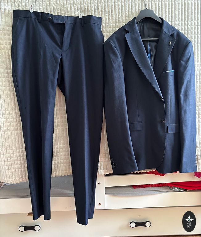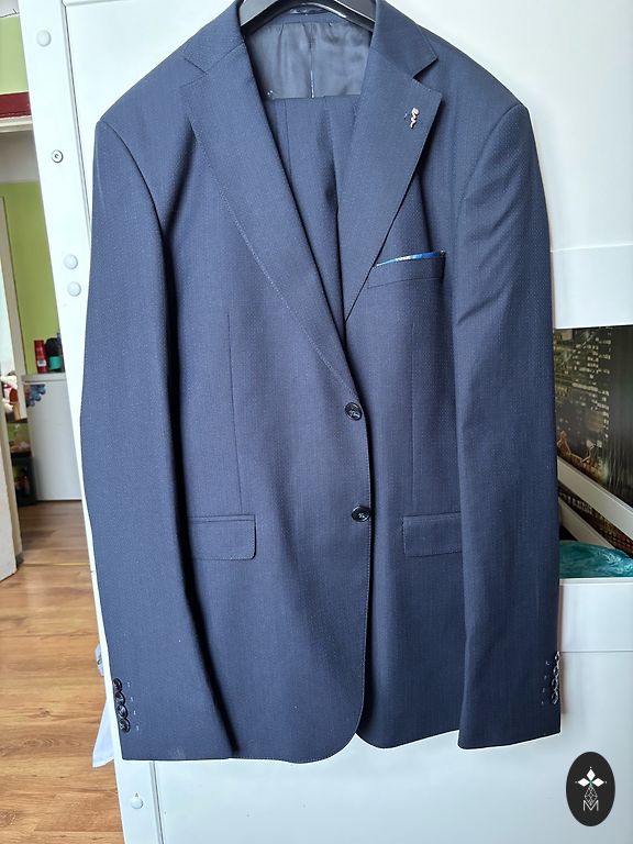 Kostīms derēs slaidam jaunēklim. Bez defektiem. Uzvilkts 9.klases izlaidumā. Klāt iet balts, kokvilnas krekls slim fit. Šlipse. Izmēri: bikses jostā 40cm, garums 98cm, žakete - pleci 45, roku garums no pleca 62cm. Pakomāta izmaksas sedz pircējs.
