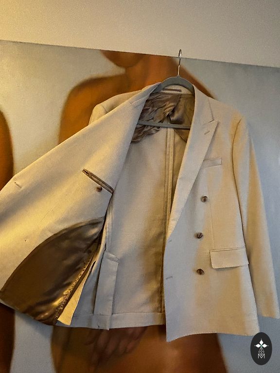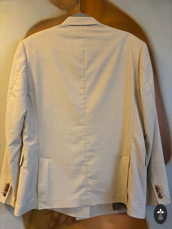 Lina žakete ar kokvilnas oderi (piedurknēs odere atšķiras no pamat oderes - ir slidenāka). Ārējās kabatas ir aizpogājamas (visas pogas ir savās vietās, tikai nav aizpogātas). Aizmugurējās šķēlumi ir aiztaisāmi ar kniede. Krāsa fotoattēlā nedaudz atšķiras no oriģināla. Льняной пиджак на хпопковой подкладке( подкладка в рукавах отличается от основной - более скользкая). Наружные карманы застёгиваются на пуговицы ( все пуговицы на месте , просто - не застёгнуты). Задние разрезы застёгиваются на кнопочку. Цвет на фото, несколько отличается от оригинала.