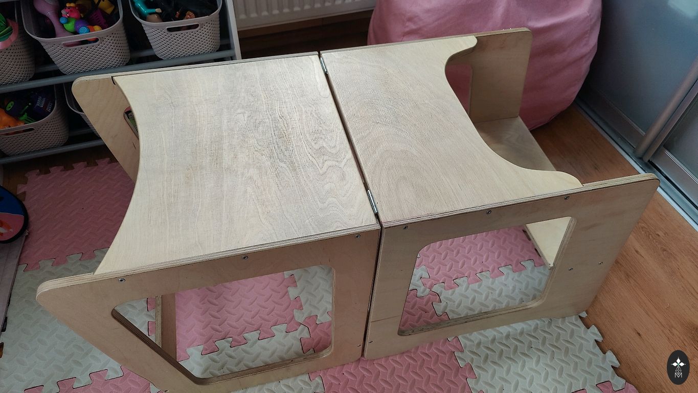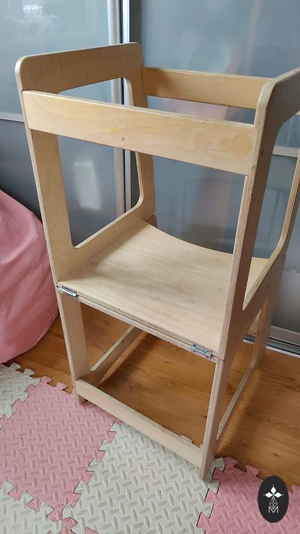 Bērna barošanas koka krēsls ar noņemamo barjeru, vēlāk var izmantot bez barjera kā bērna krēslu.
