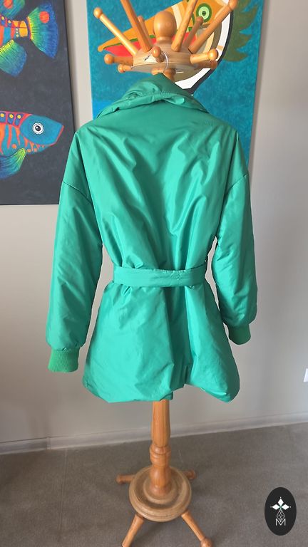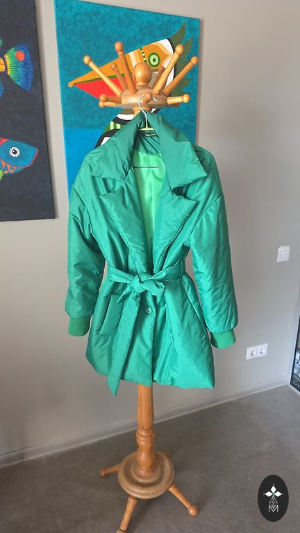 Parduodu baltą be pamušalo švarkelį, vėsiems vakarams. Švarkelio vidinė dalis yra gražiai žalios spalvos, kuri susiūta su išoriniu audiniu. Rankoves galima nešioti ir atlenktas. Dydis nurodytas 44, bet geriau tiks 42 dydžiui. Ilgis nuo peties 66 cm, krūtinė 55x2 cm, klubų plotis 58x2 cm. Paskutinėje nuotraukoje matomas mažas dėmelis virš kišenės.