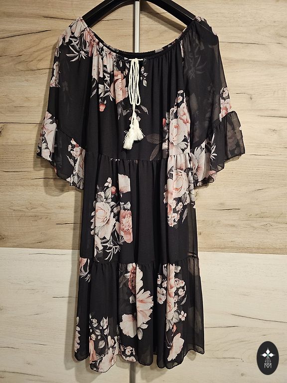 Шелковое платье JOELLE с цветами. Полностью расстегивается с помощью пуговиц, обтянутых тканью платья. Пышные акцентные рукава с красивыми манжетами и 3 пуговицами. Размер указан M EUR38. Длина 92 см, в груди 53 см, в талии 40 см, свободная юбочная часть. Платье надето 2 раза, состояние нового товара. В качестве недостатка указываю, что пропал пояс, который особо не нужен, но можно добавить простой черный пояс.