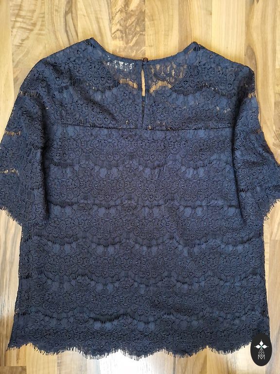 Tumesinine. Kangas kombineeritud (trikotaaž / atlas, koostis on näha 4. fotol. Suurus 42. Parameetrid: õlad 39, pikkus 58. Tagaküljel pits (3. fotol pits on selgemalt nähtav valge kanga taustal). Kaunistatud kristallidega. Näeb hea välja pidulikel hetkedel.