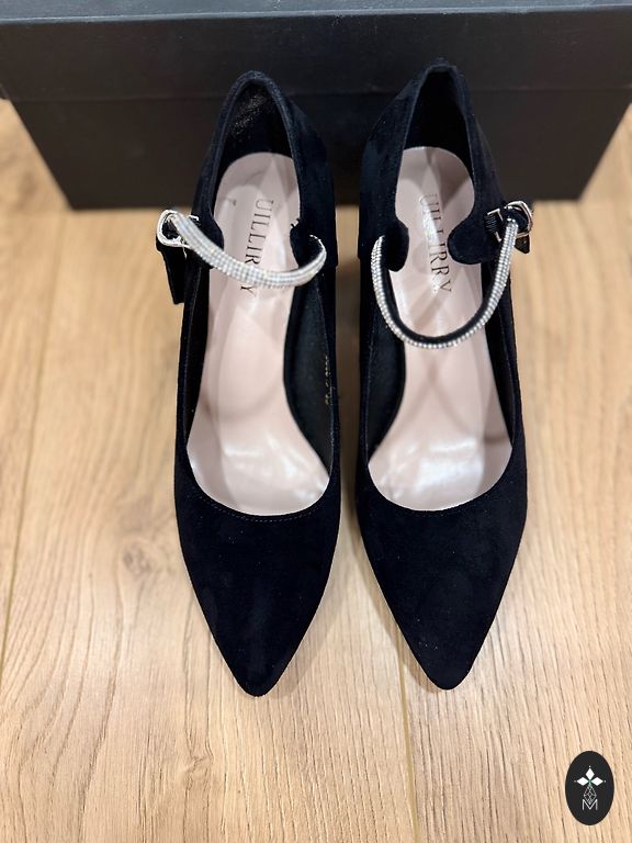 Ļoti skaistas vakara melnās kurpes ar zeltītu apmaliti uz papēža un bantītes. Vilktas vienu reizi, jo ir par lielu.