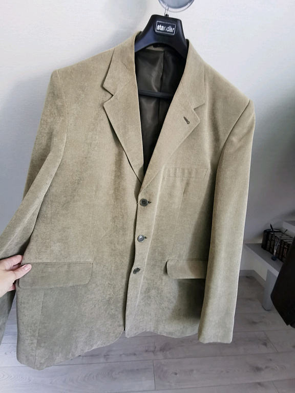 Reda – prabangus itališkas audinys. Stilius – RJ Dydis – 56 klasikinis C Ilgis 82 cm, peties siūlė – rankovė 65 cm, krūtinė 116 cm.