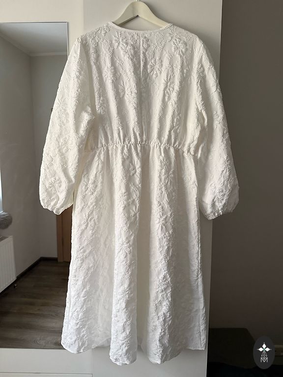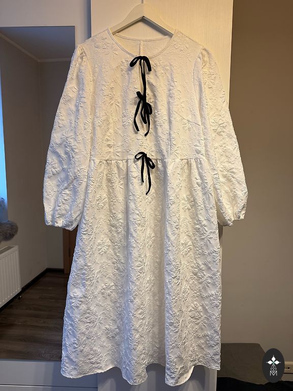 Visiškai nauja suknelė. Niekada nedėvėta (laikyta spintoje). Užsegama nugaroje. Trumpomis rankovėmis ir mažais raukiniais apačioje. Pristatymas įskaičiuotas į kainą.