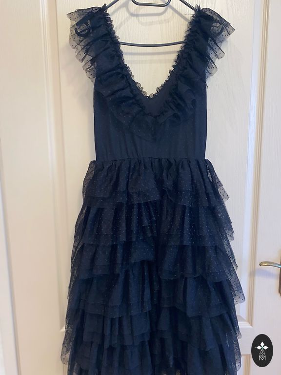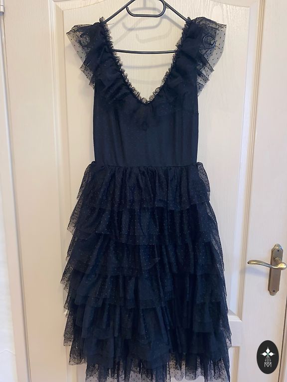 Kolosālas vasars pērle, viegla, gaisīga ar oderīti. Skaists izgriezums, materiāls iešuts slēpās faltēs. Zelta jostiņa (labāk mainīt), aizdare sānos ar rāvējslēdzēju.